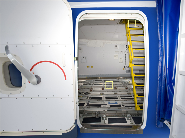 The forward door provides access to the upper deck and main cargo area. The stairs led up to the Supernumerary area and flight deck.